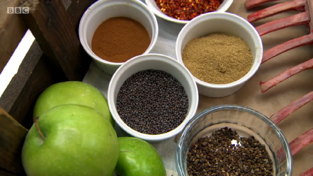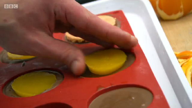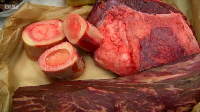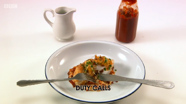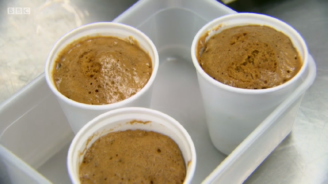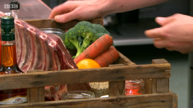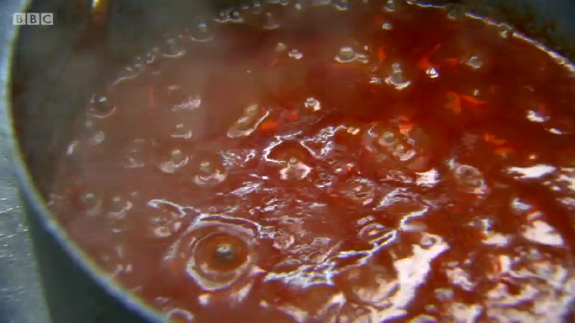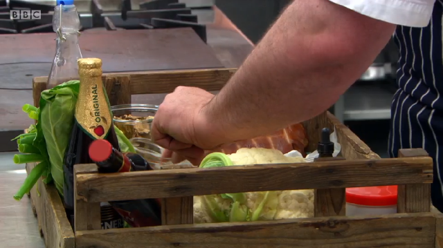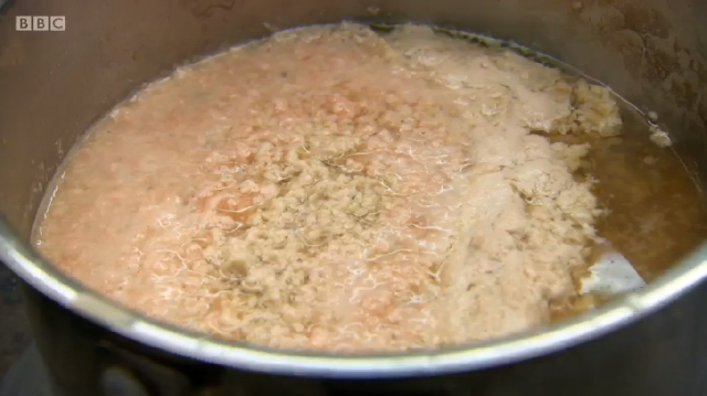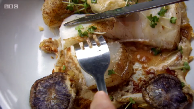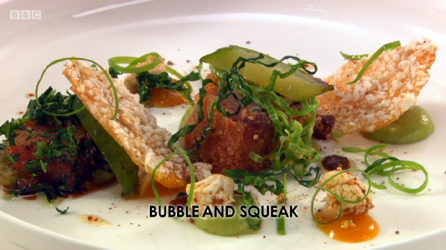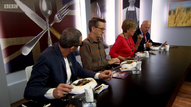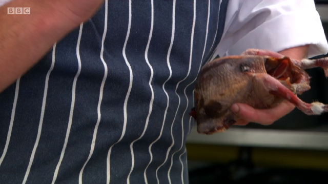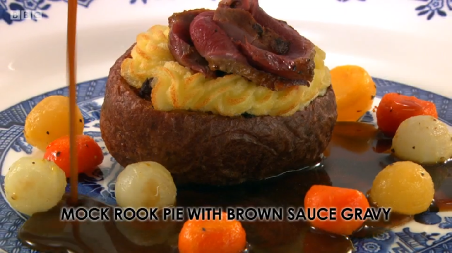 Ronnie Murray had spent a lot of time in the library above the restaurant prior to the show, researching his dishes in old cookbooks. His menu was a look at some of British historic dishes, starting with rook pie. As it is now illegal to shoot rook commercially, Ronnie was cooking pigeon – mincing the leg meat, pan frying the breast and using the carcass to make a gravy. He too was using brown sauce but did not make his own like Russell did – he simply added it to the gravy at the end. He also chose to incorporate pigeon livers into the mince, despite advice from his previous boss Mark Hix who said they might be too strong a flavour.