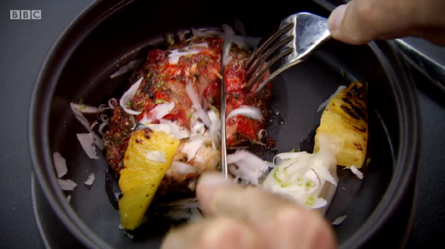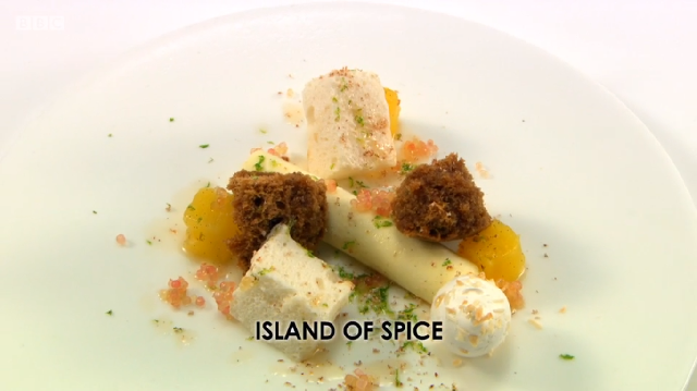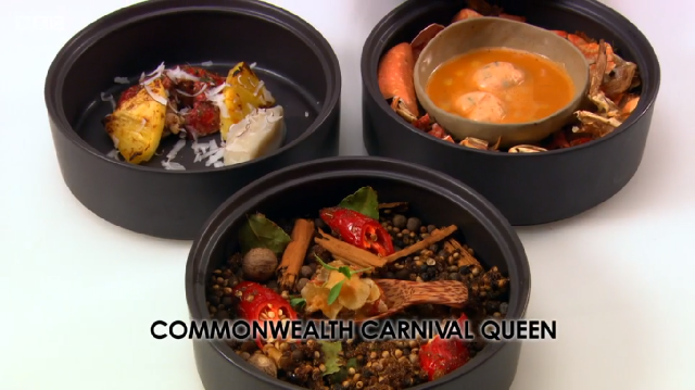 Current leader Russell had been inspired by the Notting Hill Carnival and chose to put a taste of the Caribbean in his dish. He was cooking Cornish lobster three ways using jerk spices and highlights of pineapple and coconut to pack the flavours in.