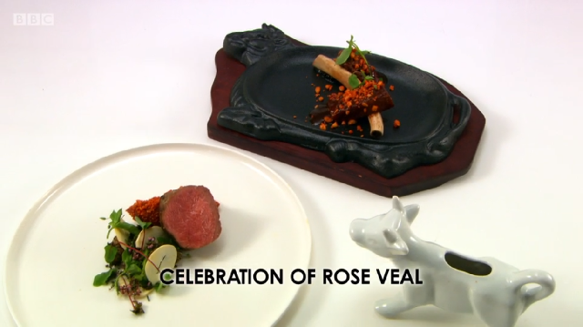Mark Froydenlund seemed to be feeling the pressure more than his peers, having received a nine for his main course the year before. His dish ‘A Celebration of Rose Veal’ was a tribute to British farmers and how their quality produce has helped to transform British food over the years. He poached and roasted his rack of veal, then vacuum packed the eye cooking it in a marinade in the water bath. The sauce had a barbecue base but resembled a classic jus.