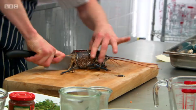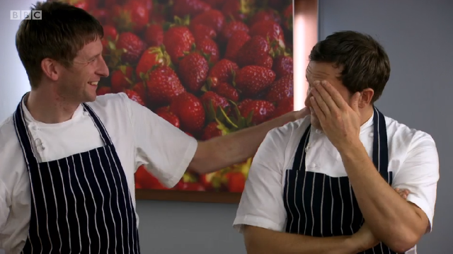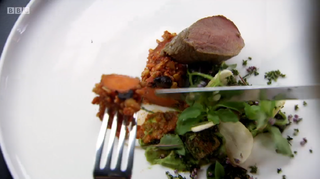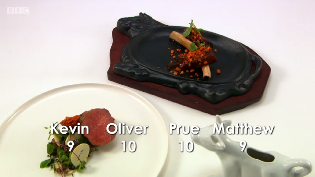 Richard was completely overwhelmed by Russell’s fish course and scored him a perfect ten. He gave Ronnie an eight and said that with a few tweaks, his oysters could be at the Banquet. Mark got the lowest score of the day with a seven. Russell said that “nuances of cooking times should be spot on for a chef of your calibre”.