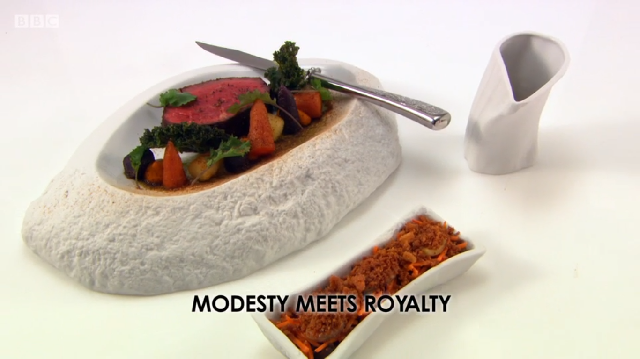 Currently well in the lead, Russell Bateman said there was still “no room for complacency” as he began his dish ‘Modesty Meets Royalty’. Based on the moment that a Great Briton meets the Queen for the first time, Russell was cooking modest ingredients but hoping to elevate them to Banquet standard. He started by braising beef cheek in treacle before cooking it sous vide. He smoked bone marrow and made sourdough breadcrumb cooked in beef dripping. He also caramelised a beef fillet before finishing it with the treacle and a spice mix.