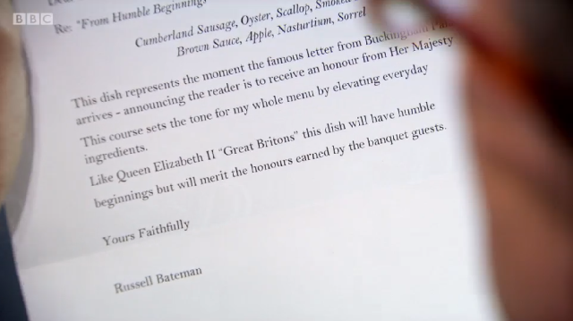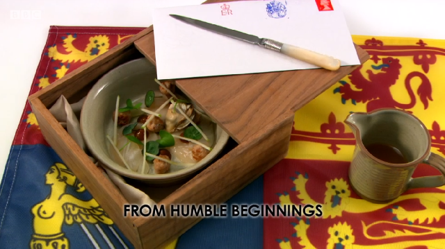 ‘From Humble Beginnings’ was a dish representing the moment that a Great Briton gets their letter from Buckingham Palace. The bowls were served in presentation boxes with the letter on top and the hot sausage broth in jugs on the side.