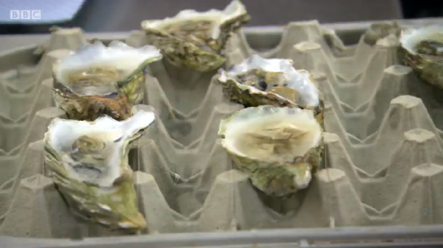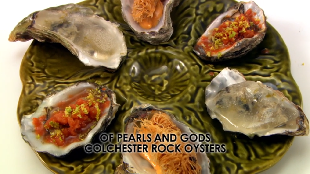 Ronnie Murray was cooking Colchester rock oysters. Was this a bit of a risk with Richard as their judge? He prepared the oysters at three different temperatures – warm, chilled and frozen. The raw ones were topped with a Bloody Mary frozen granita and garnished with freshly chopped celery leaf. The chilled oysters were served in a gin and tonic jelly. Ronnie deep fried the remaining oysters in crispy angel hair pastry at the last minute, which he served with a spicy mayonnaise.