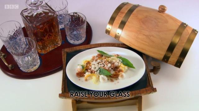 Michael Bremner was disappointed with a score of seven for his main, having got a ten for his fish course earlier in the week. For the dessert course, he wanted to recreate his favourite childhood puddings but make them more contemporary and refined. The great Scot that inspired ‘Home Sweet Home’ was Maitland Mackie CBE, an award winning dairy farmer and late chairman of Mackie’s ice cream. Michael even went to Mackie's and met his son and daughter. To honour him, Michael made whiskey ice cream covered with a whiskey gel – jelly and ice cream for grown ups!