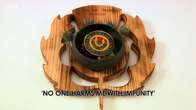 Ally McGrath, who was sitting two points behind the other two chefs needed a higher score for his dessert to stay in the competition. His dessert ‘No One Harms Me With Impunity’ was themed around Scotland’s highest order of chivalry, ‘The Order of the Thistle’. He too would be making aerated chocolate and he joked that Adam was a ‘copycat’!