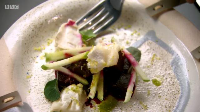 He served sous vide slices of golden and candied beetroot with apple matchsticks and crumbled oatcake.