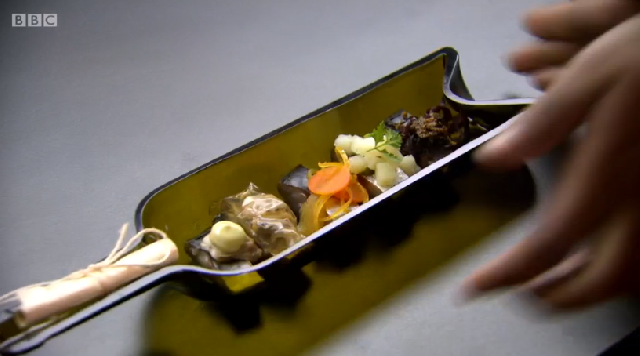 First to explain his box of ingredients was the youngest chef in the competition, Adam Handling. You might remember Adam as a finalist on Masterchef: The Professionals in 2013, where he was beaten by Steven Edwards. Adam's menu throughout the show is said to be 'celebrating the achievements of British producers' and this was evident in his starter, 'Boarding Passes Ready'.