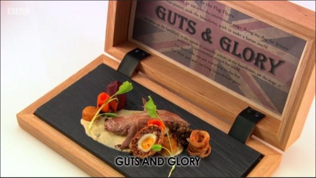 Next to talk us through his starter was Ally McGrath, the only Scot still cooking in Scotland at his restaurant Osso in Peebles. His dish 'Guts and Glory' aimed to demonstrate how those who give their guts and give everything they've got to represent Britain, receive the glory that is the Queen's honor.