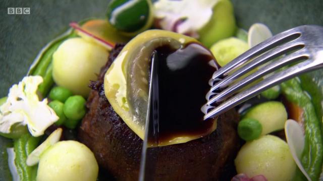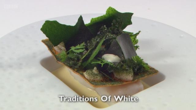 Michael’s fish course, Traditions of White, was inspired by the Wimbledon dress code. Nathan Outlaw scored it a nine earlier in the week but thought that the potato tuile wasn’t crispy enough. The judges liked the tuile and Matthew Fort said that the turbot was “perfectly cooked”.