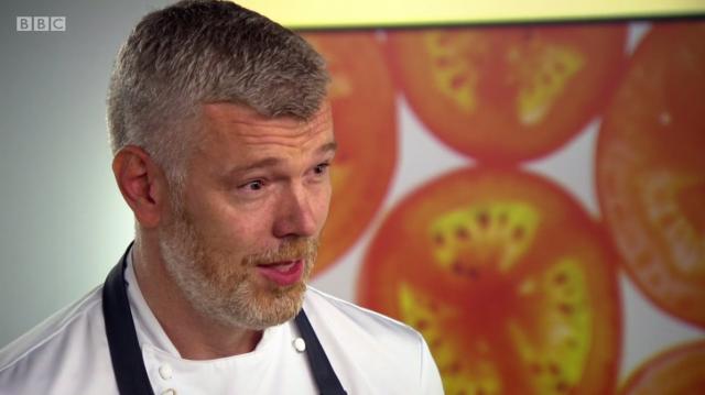 Great British Menu contestant 2017, Ally McGrath, of Osso restaurant, was first to the pass last night with his dish Messing About In The River, which was inspired by his childhood summers splashing about in rock pools. The dish impressed both competition veteran, Nathan Outlaw, and the other chefs. They enjoyed the flavours of the trout, trout mousse and a microwaved dill sponge. The bright green creation intrigued Nathan, who said Ally had taught him a trick when he demonstrated how to make it.