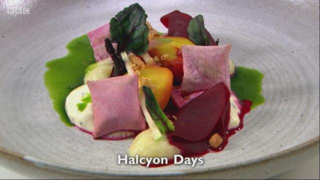 Ally was last to the pass to serve his starter Halcyon Days which was an array of the Wimbledon colours: purple, green and white. It included roasted golden and red beetroot bavarois, roasted golden and micro red beetroot, dill seed ricotta, pickled beetroot and julienne apple, beetroot leaves and blackcurrant leaf oil.