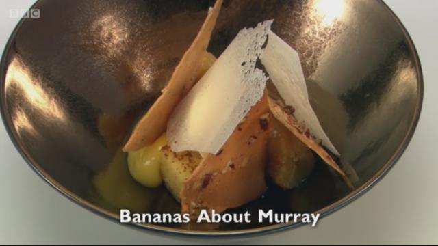 First to plate up was Michael, who slipped into second place after a disappointing main course. He cooked a dessert in honour of Scottish Wimbledon champion Andy Murray and inspired by the many bananas which tennis players eat during the tournament. Bananas About Murray contained yoghurt sponge, passionfruit curd, poached banana, pecan and maple tuile, yoghurt sorbet and yoghurt-sugar crisp.