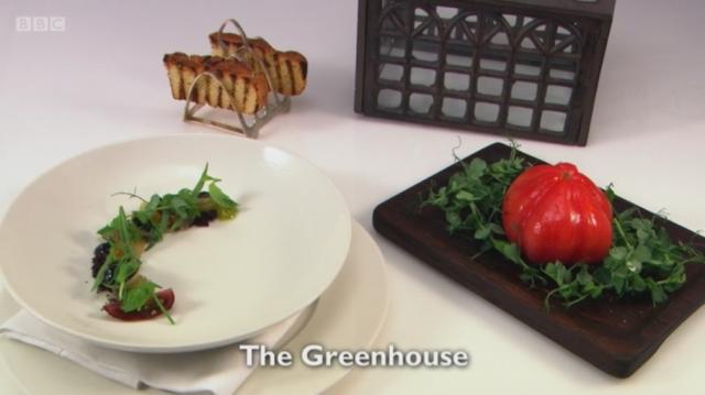 Sadly Phil’s jelly turned back into consommé and swam around his pretty plate. Despite the jelly wobble, Tom liked the rich flavour of the stuffed tomato and the chefs were impressed with his effort.
