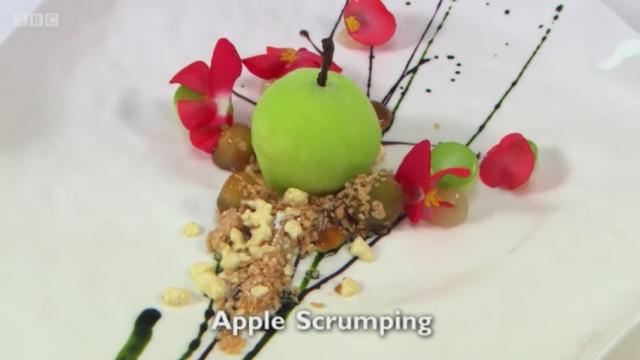 Nick piped chocolate sauce onto a plate to look like an apple tree. How creative? Onto this he placed caramelised apples, white chocolate mousse dipped in green apple gel to look like an apple, caramel powder and frozen crème anglaise. He garnished with apple blossom.
