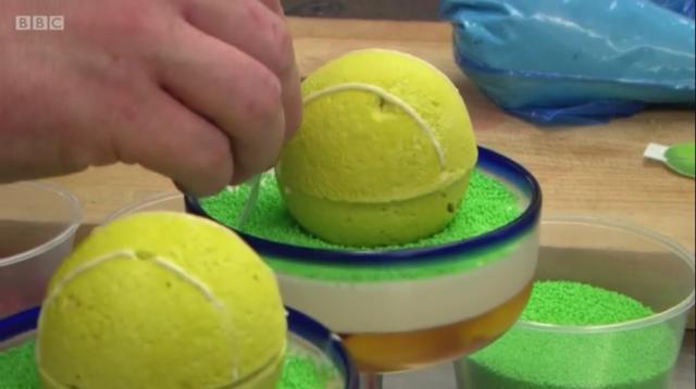 Game, Set & Massive Mess comprised layers of champagne mousses with green sprinkles and Eton mess hidden inside an edible tennis ball made of meringue. He finished by decorating with rice paper tennis racquets.