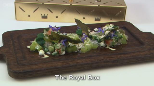 Paul served water bathed, barbecued king crab and pickled queen scallops with yoghurt, compressed cucumber and salsa verde. He drizzled with lemon puree and served in a gold box to highlight the royal connection.