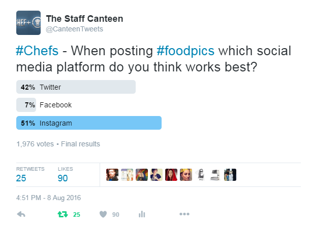 Much has changed on Instagram, it's now owned by uber rich Facebook, who interestingly changed their wall layout to show images much larger, a direct result of the purchase. However, the popularity of the social network remains, so we decided to create a poll and ask the following question: "Chefs-when sharing images of your food, which social platform do you think works best?" We offered three choices Instagram, Facebook and Twitter, those who took part had to pick just one social network. We created a poll on Facebook