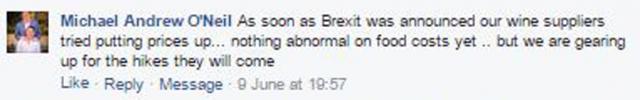 On Facebook, Michael Andrew O’Neil said: “As soon as Brexit was announced our wine suppliers tried putting prices up…nothing abnormal on food costs yet but we are