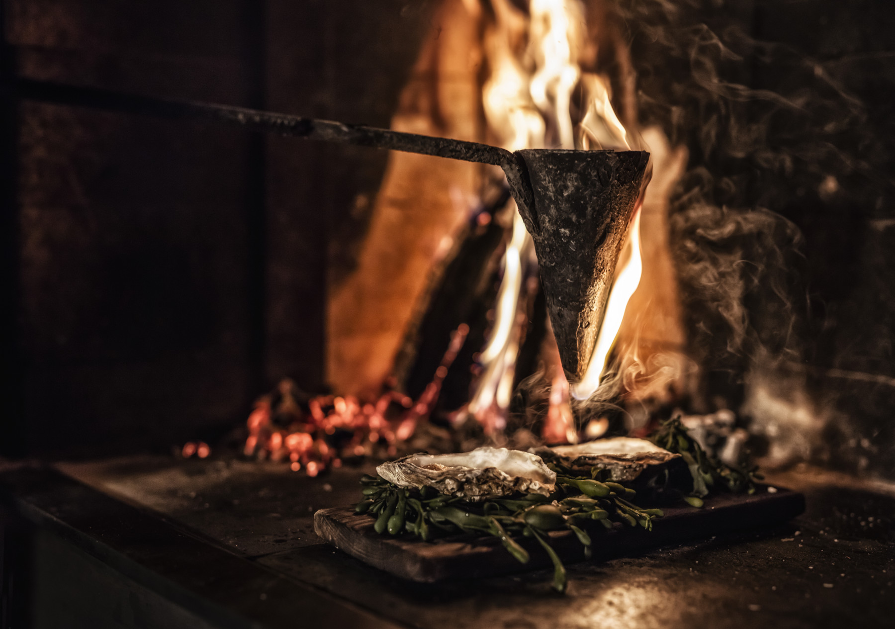 fat, a longstanding technique that was used in old Scandinavian cooking. The oyster is placed underneath the cast iron cone collecting fat which drips onto the oyster cooking it in the process. A particular method Niklas affirms was used by his ancestors before pots and pans were invented.