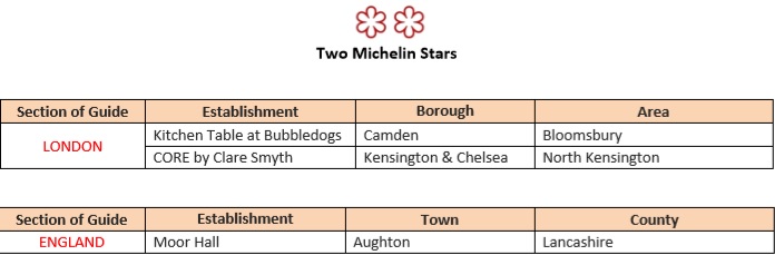 In addition to the above, there were also 21 new one stars, but there were no new three-star restaurants in the UK and Ireland. Here is that all-important list of three, two and one-star winners as well as those that have unfortunately lost their star: