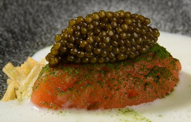 Smoked brown trout tartare sansho, warm potato sauce and oscietra caviar