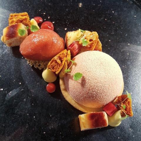 And at number ten: Double Irish rhubarb mousse, ginger soaked baba, honeycomb rubble by @AlanHigginsChef