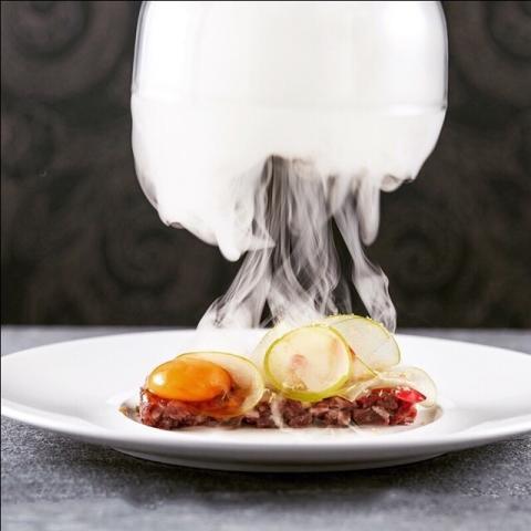 In fifth: Smoked Wagyu Tartare, Apples, Hens Egg, Foie Gras by @MikeReidchef