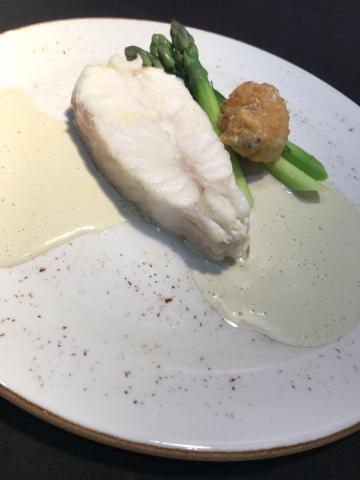 Next up was, Tom Brown, head chef at Nathan Outlaw's Michelin-starred restaurant, Outlaw's at The Capital. Priding themselves on serving the best fish in town, Tom was cooking turbot on the bone with oyster, asparagus and pickled celery. Tom used ingredients from his home county, Cornwall and the audience were intrigued as he served the fish with a warm oyster mayonnaise.