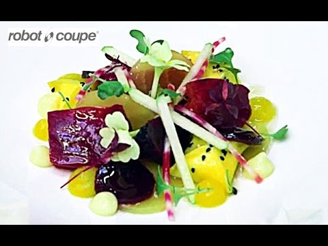Cooked beets served with Golden beetroot ketchup by Simon Hulstone