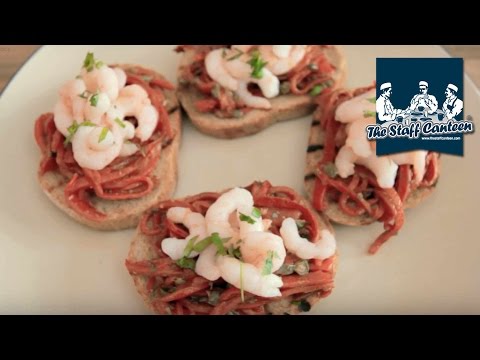 Chef Russell Brown creates Wild Atlantic prawns and piquillo pepper crostini