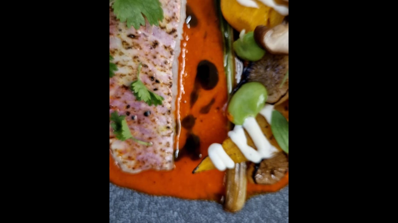 Red Mullet/ roasted peppers/ leeks/ compresed shiitake/ horseradish/broad bean/ Coriander